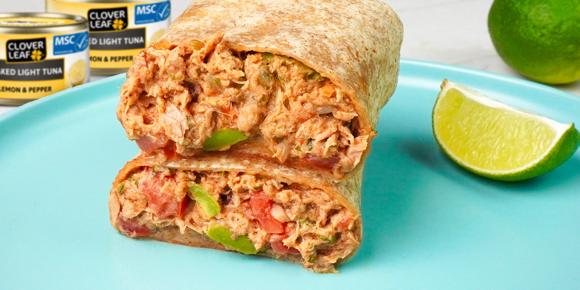 3. Place the mixture on the flour tortilla and roll tightly. Place the wrapped tuna onto a baking sheet and bake for approximately 5 minutes or until golden brown.